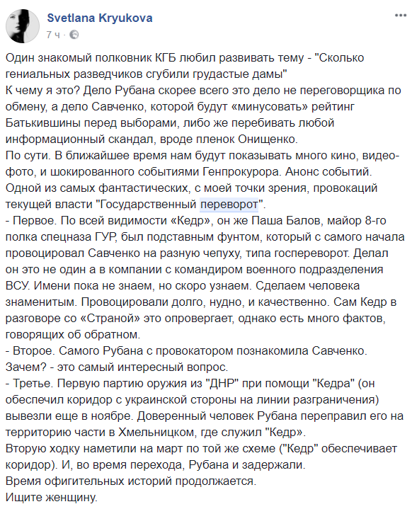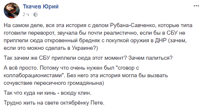 "На самом деле вся эта история с делом Рубана-Савченко, которые типа готовили переворот, звучала бы почти реалистично, если бы в СБУ не приплели сюда откровенный бредняк с покупкой оружия в ДНР (зачем, если это можно сделать в Украине?)