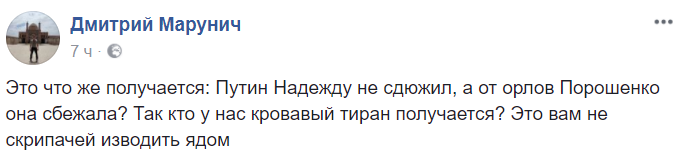Позже он добавил, что "Путин Надежду не сдюжил, а от орлов Порошенко она сбежала. Так кто у нас кровавый тиран получается? Это вам не скрипачей изводить ядом".