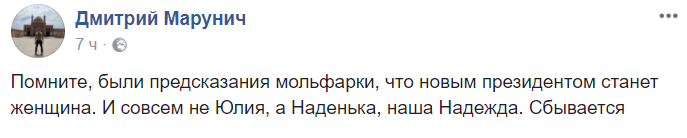 "Помните, были предсказания мольфарки, что новым президентом станет женщина? И совсем не Юлия, а Наденька, наша Надежда. Сбывается".