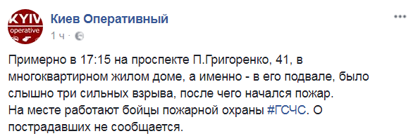 Около 17:15 вторника, 13 марта в Киеве в подвале многоквартирного жилого дома по адресу проспект Петра Григоренко, 41 - начался пожар. Ранее там были слышны три сильных взрыва.