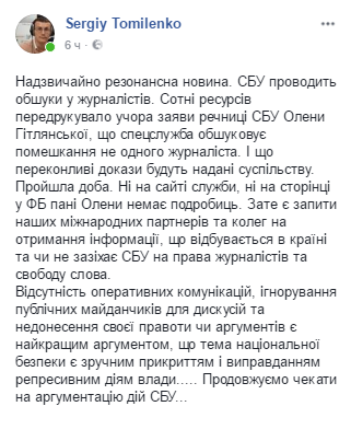 "СБУ проводит обыски у журналистов. Сотни ресурсов перепечатало вчера заявление пресс-секретаря СБУ Елены Гитлянской, что спецслужба обыскивает квартиры журналистов. И что убедительные доказательства будут предоставлены обществу. Прошли сутки. Ни на сайте службы, ни на странице в ФБ госпожи Елены нет подробностей. Зато есть запросы наших международных партнеров и коллег на получение информации, что происходит в стране и едва ли, не посягает СБУ на права журналистов и свободу слова. Отсутствие оперативных коммуникаций, игнорирование публичных площадок для дискуссий и недонесение своей правоты или аргументов является лучшим аргументом, что тема национальной безопасности является удобным прикрытием и оправданием репрессивных действий власти... Продолжаем ждать аргументацию действий СБУ...", - написал он.