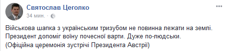 Пресс-секретарь президента Святослав Цеголко рассказал, что Петр Порошенко поднял шапку воина почетного караула, упавшую во время официальной встречи с президентом Австрии Ван дер Белленом.