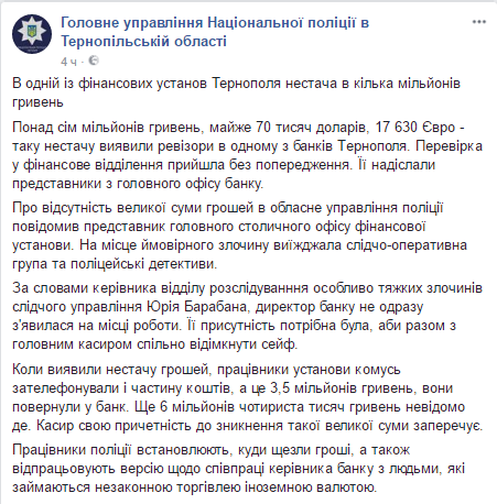 В отделении одного из банков Тернополя обнаружили недостачу почти на 10 млн грн. Об этом в среду, 14 марта, сообщили Facebook пресс-службы полиции в Тернопольской области.