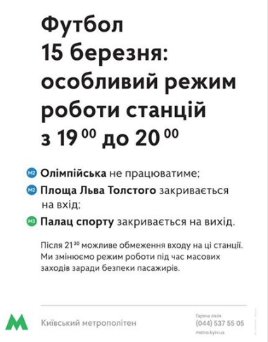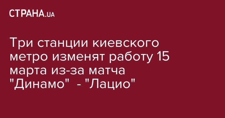 В четверг, 15 марта, в работу некоторых станций Киевского метрополитена будут внесены изменения в связи с проведением футбольного матча между командами "Динамо" (Киев, Украина) и "Лацио" (Рим, Италия) на НСК "Олимпийский", сообщает пресс-служба коммунального предприятия "Киевский метрополитен" в Facebook.