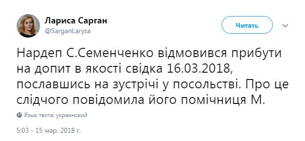 Нардеп от "Самопомощи" Семен Семенченко не придет на допрос в Генпрокуратуру 16 марта.