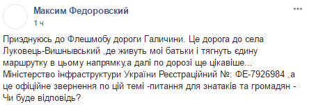 "Присоединяюсь к флешмобу дороги Галичины. Это – дорога в село Луковец-Вишневский, где живут мои родители. Тянут единственную маршрутку, которая ходит в этом направлении. А дальше по дороге еще интереснее… ", - сказано в сообщении.