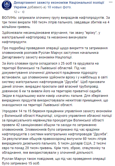 По данным полиции, группа из 25 человек занималась хищениями на территории Волынской и Львовской областей. С начала месяца они похитили более 160 тыс. литров дизельного топлива, причинив ущерб в размере 4 млн гривен.