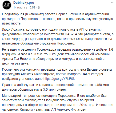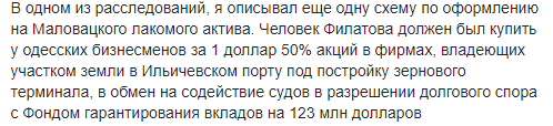 "После чего эта компания перешла под контроль члена Высшего совета правосудия Алексея Маловацкого, против которого НАБУ сегодня возбудило уголовное дело. Права на добычу газа и конденсата оценочной стоимостью в 450 млн долларов обошлись ему в 3,5 млн гривен… В одном из расследований, я описывал еще одну схему по оформлению на Маловацкого лакомого актива. Человек Филатова (заместитель главы Администрации Президента Украины Алексей Филатов) должен был купить у одесских бизнесменов за 1 доллар 50% акций в фирмах, владеющих участком земли в Ильичевском порту (теперь - морской торговый порт "Черноморск", Одесская область) под постройку зернового терминала", - написал Дубинский.