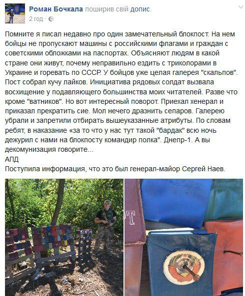 "Я писал недавно про один замечательный блокпост. На нем бойцы не пропускают машины с российскими флагами и граждан с советскими обложками на паспортах. Объясняют людям, в какой стране они живут, почему неправильно ездить с триколорами в Украине и горевать по СССР. У бойцов уже целая галерея "скальпов". Пост собрал кучу лайков.