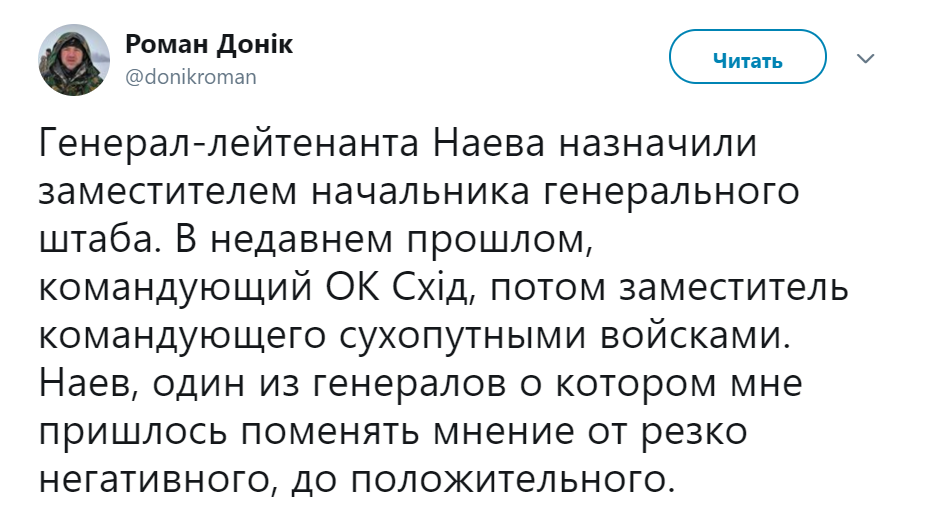 На днях, когда Наев получил назначение в Генштаб, армейский волонтер Роман Доник написал о нем: