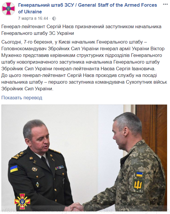 Буквально неделю назад – 7 марта – Наев стал первым заместителем главы Генштаба Виктора Муженко. Судя по всему, вопрос его назначения в АТО был решен уже тогда.
