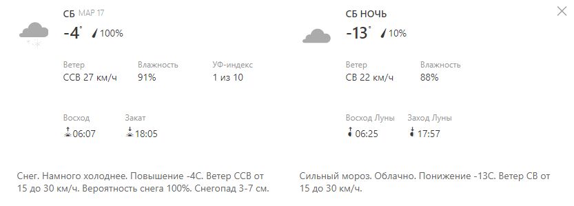 Gismeteo более пессимистичен: оба выходных пасмурно, снег, до 12 градусов мороза.