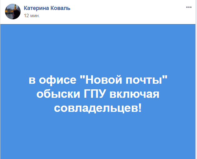 Также об обысках на "Новой почте" сообщила адвокат Союза юристов Украины Катерина Коваль.