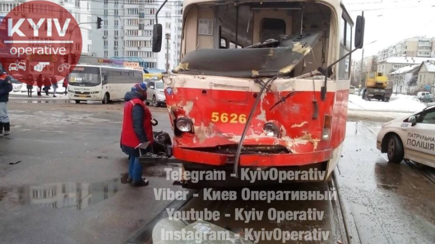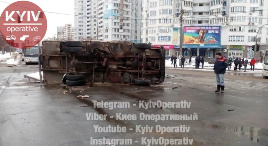 На Тростянецкой в Киеве грузовик налетел на трамвай и перевернулся