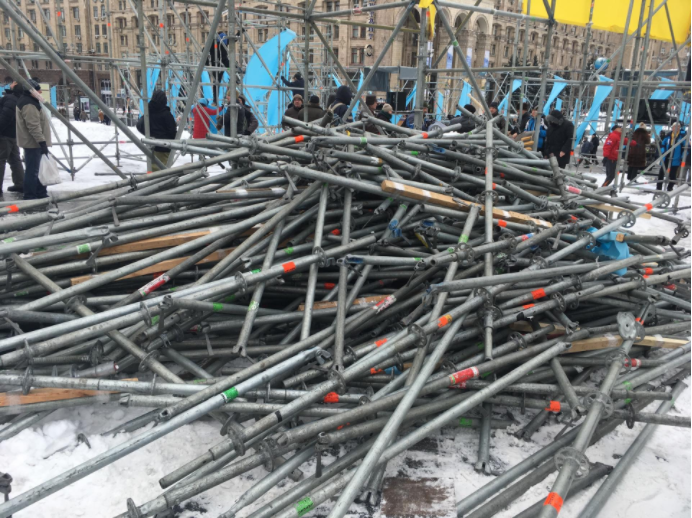 Во время марша за импичмент Петра Порошенко митингующие на Майдане разобрали металлические конструкции, установленные ранее.Они заявили, что установкой этих конструкций власть пыталась помешать собранию.