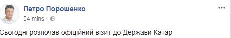"Сегодня начал официальный визит в Государство Катар", - написал Порошенко в своей странице в Facebook.