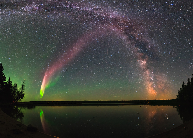 Полярные сияния STEVE и Млечный Путь над озером Чайлдс в Канаде, фото: Courtesy of Krista Trinder/nplus1.ru