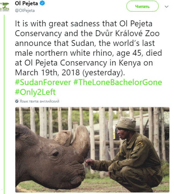 В заявлении кенийского заповедника Ол Пейета говорится, что 45-летний носорог был подвергнут эвтаназии в понедельник, 19 марта, после того, как его состояние "значительно ухудшилось" и он больше не мог стоять. У животного были дегенеративные заболевания мускул и костей, а на коже появились обширные раны.