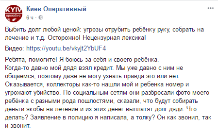 "Я боюсь за себя и своего ребенка. Когда-то давно мой дядя взял кредит (в конторе по оформлению быстрых займов. – Прим.Ред) . Мы уже давно с ним не общаемся, поэтому даже не могу узнать, правда это или нет. Оказывается, коллекторы как-то нашли мой и ребенка номер и угрожают убийством. Заявление в полицию я написала, а толку? Он как звонил, так и звонит", – пожаловалась киевлянка.