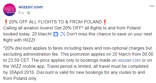 Акция будет действовать на все авиарейсы в Польшу и из Польши при бронировании авиабилетов до 23:59 20 марта по центрально-европейскому времени (01:00 ночи 21 марта по Киеву).
