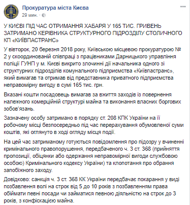 Во вторник, 20 марта, начальник одного из структурных подразделений коммунального предприятия "Киевпастранс" был задержан при получении взятки в размере 165 тысяч гривен. Об этом сообщает пресс-служба прокуратуры Киева на странице в Facebook.