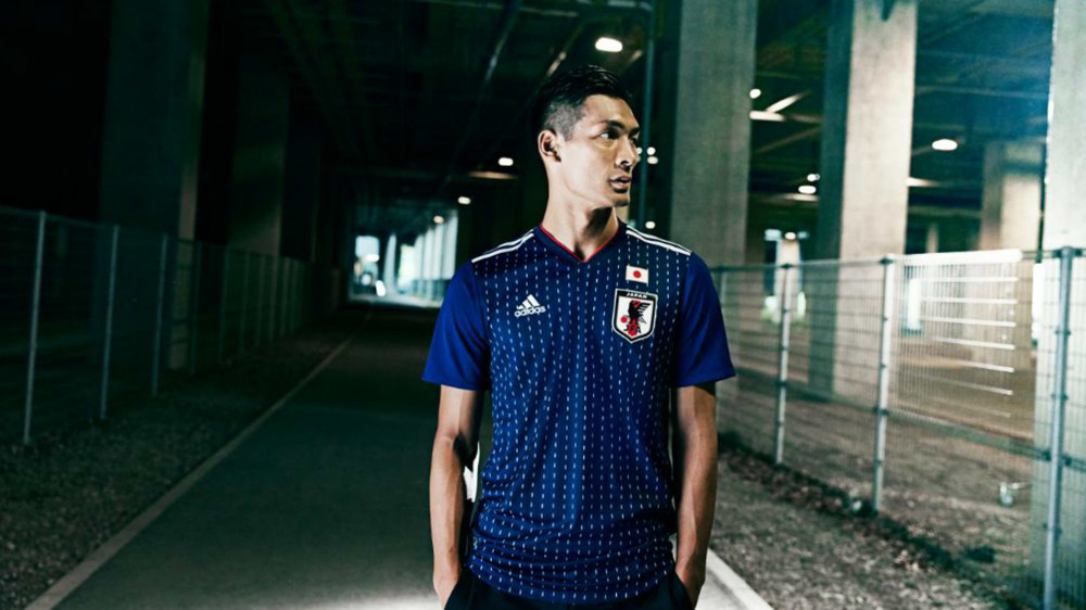 Форма японцев от Adidas получилась весьма оригинальной – темно-синей с белыми точками. Три адидасовских полоски белого цвета на плечах присутствуют.