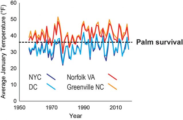 "К примеру, сейчас в Вашингтоне для пальм слишком холодно, так как средняя температура в январе не превышает 34 градусов по Фаренгейту, − говорит Рейхгельт. – Но мы думаем, что в ближайшее время можно ожидать расширения диапазона их распространения по Америке, потому что температуры постепенно растут".