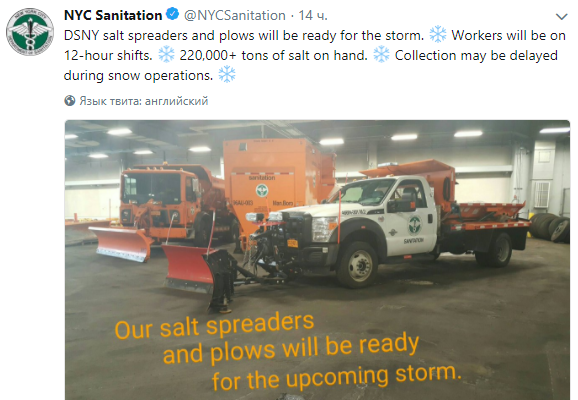 В санитарном управлении Нью-Йорка уже приготовили тонны соли, которой будут посыпать дороги.