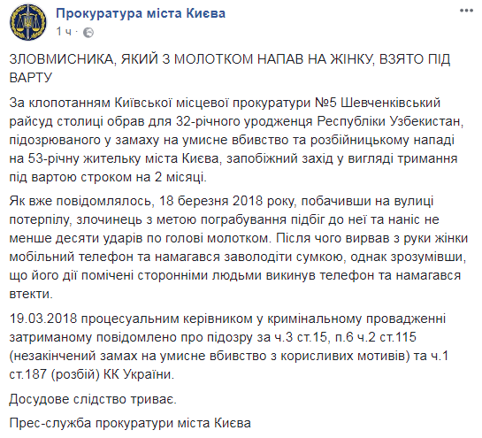 Шевченковский райсуд Киева избрал для 32-летнего уроженца Узбекистана меру пресечения в виде содержания под стражей на 2 месяца. Он подозревается в покушении на умышленное убийство и разбойничье нападение на 53-летнюю киевлянку.
