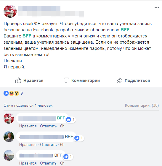 По сотрясаемой скандалом о краже личных данных социальной сети Facebook начал распространяться ложный слух о том, что якобы "можно проверить, защищен ли аккаунт, или срочно нужно менять пароль, вбив в комментарии слово BFF".