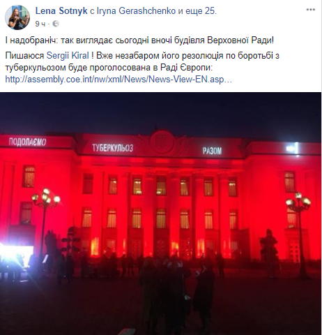 22 марта здание Верховной Рады Украины подсветили красным светом в рамках акции "Пусть засияет мир, свободный от туберкулеза". По данным Минздрава, ежедневно в Украине умирает 11 людей от туберкулеза.