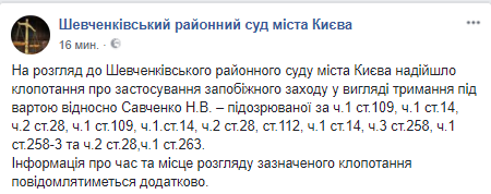 Шевченковский райсуд Киева, который должен сегодня избрать меру пресечения нардепу Надежде Савченко, получил ходатайство об избрании ей меры пресечения в виде содержания под стражей.