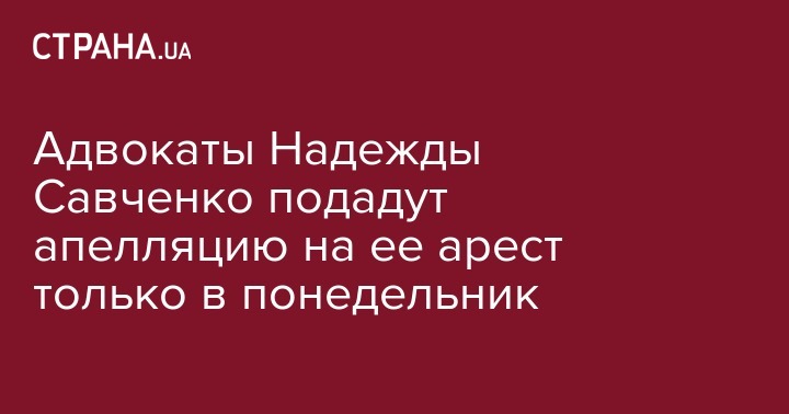 Народный депутат Надежда Савченко в понедельник будет подавать апелляцию на решение суда об избрании ей меры пресечения в виде содержания под стражей без права внесения залога. Об этом сообщает "Укринформ".