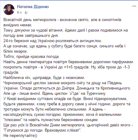 "24-го марта над Украиной развернется антициклон. А это значит, что днем в субботу будет много солнца, синего неба и белых облаков. То есть, придет красивая погода. Даже дневная температура воздуха мартовскими дорогими духами побрызгает воздух - в Украине до + 1 до + 5 градусов", - написала она в Facebook.