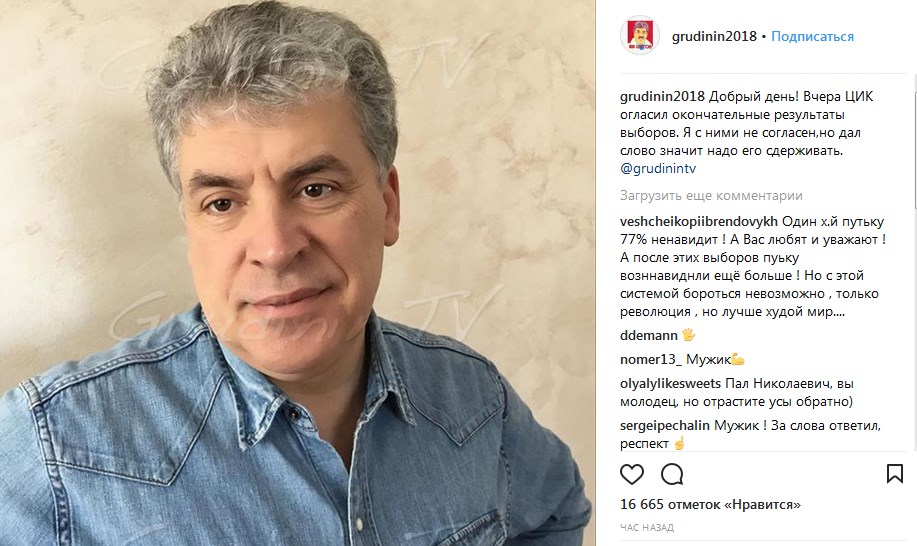 Ранее Грудинин сказал, что выполнит условие спора с Дудем и сбреет усы в том случае, если журналист на камеру скажет, что считает прошедшие выборы честными.