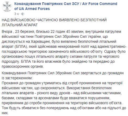 Так, накануне вечером, 23 марта около 22:45, внутренний патруль воинской части выявил беспилотник, который осуществлял неуправляемый полет над административно-хозяйственной территорией данного военного объекта.