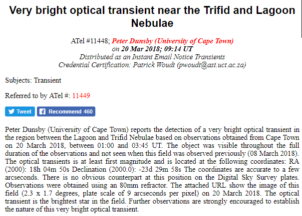 Питер Дансби опубликовал там известие о том, что 20 марта он обнаружил чрезвычайно яркий объект рядом с Тройной туманностью и туманностью Лагуна, но еще 8 марта на этом участке звездного неба ничего такого не было.