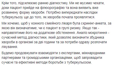 "Кроме того, усиливаем раннюю диагностику. Мы не должны ждать, пока пациент придет на флюорографию и она обнаружит уже развитую форму болезни. Нужно опережать последствия туберкулеза еще до того, как болезнь начала проявляться. Мы хотим, чтобы у каждого семейного врача была скрининг-анкета, по которой он будет определять, является ли пациент в группе риска", - добавила Супрун.