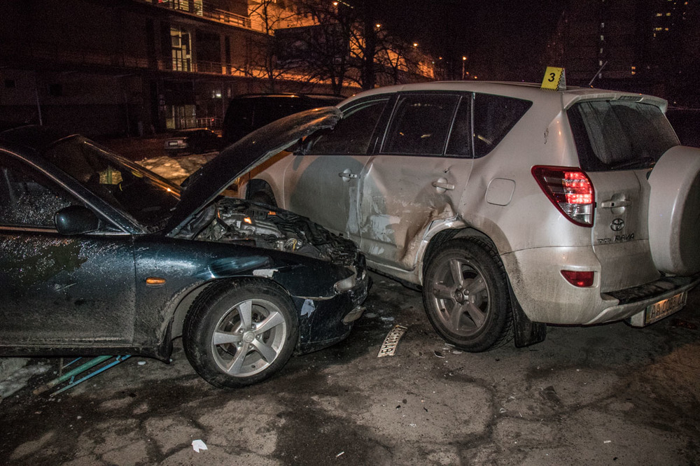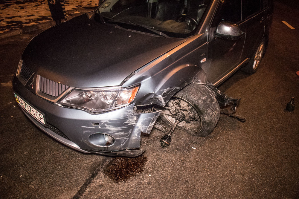 Mazda протаранила ограждение тротуара, после чего врезалась в припаркованную Toyota Rav 4. В авто было девушка с ребенком. Mitsubishi остановился лишь через несколько десятков метров. У него вывернулось колесо.