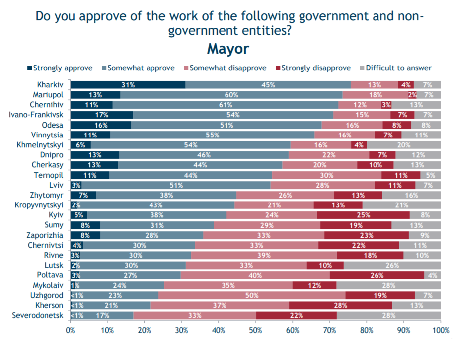 На муниципальном уровне лидирует мэр Харькова – его работу одобряет 76% жителей города. Аутсайдером же стал городской голова Северодонецка.