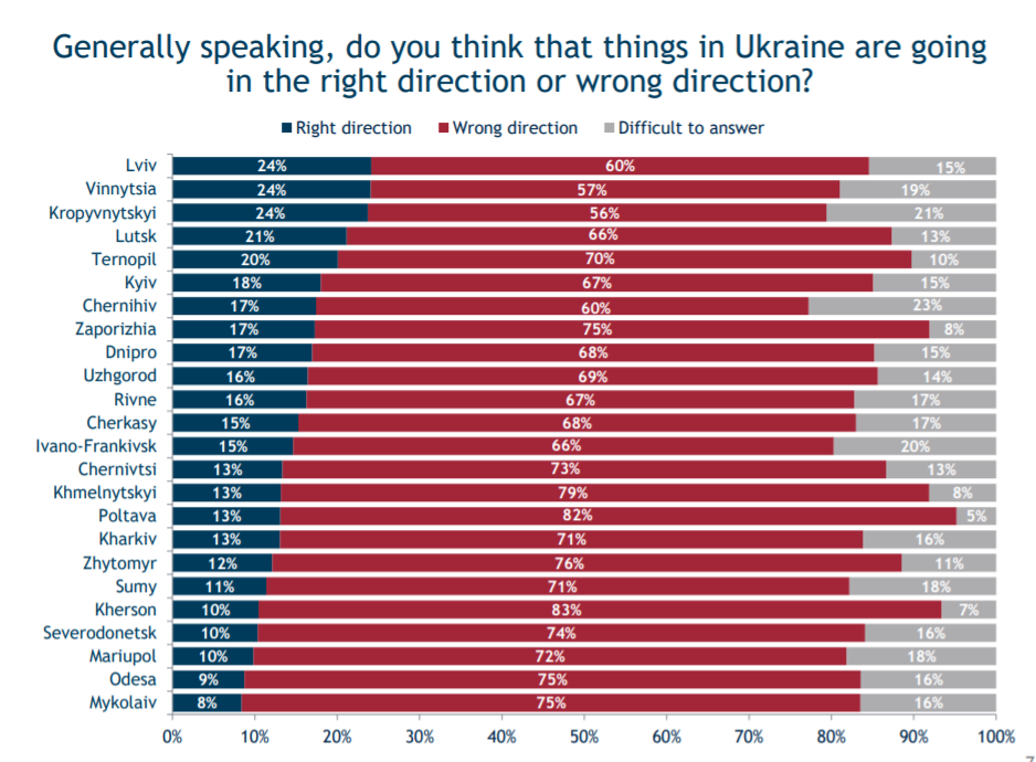 Самые оптимистичные города – это Львов, Винница и Кропивницкий, где видят перспективу 24% опрошенных. Меньше всего оптимистов – в Херсоне, Северодонецке и Мариуполе (по 10%), Одессе (9%) и Николаеве (8%).