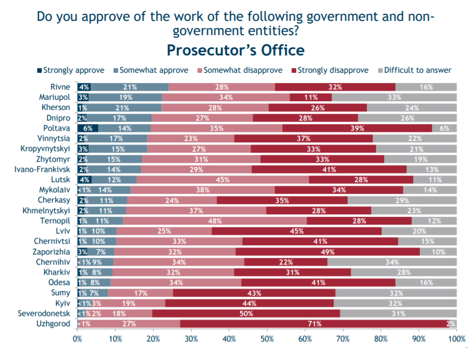 Большинство жителей каждого областного центра также не одобряет работу прокуратуры. Антирейтинг ведомства Юрия Луценко – от "минимальных" 60% в родном Ровно до запредельных 98% в Ужгороде.