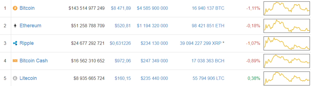 Криптовалюта биткоин за сутки подешевела на 1% до $8 471. Немного потеряли в цене и другие криптовалюты.
