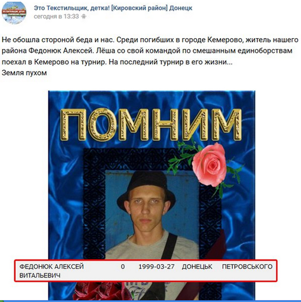 Во время смертоносного пожара развлекательного центра "Зимняя вишня" в российском Кемерово, среди 64 погибших был житель Донецка Алексей Федонюк. Об этом сообщают друзья парня в соцсетях.
