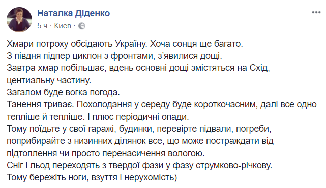 "Облака понемногу осаждают Украины. Хотя солнца еще много. С юга подошел циклон с фронтами, появились дожди. Завтра облаков станет больше, днем ​​основные дожди сместятся на восток, центральную часть. В целом будет сырая погода. Таяние продолжается. Похолодание в среду будет кратковременным, дальше все равно теплее и теплее. И плюс периодические осадки", пишет Диденко.