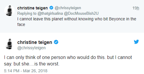 Американская модель и телеведущая Крисси Тейген заявила, что догадывается кто это, но не скажет, поскольку боится и это действительно самая худшая личность.