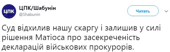 "Суд отклонил нашу жалобу и оставил в силе решение Матиоса о засекреченности деклараций военных прокуроров", – говорится в сообщении.