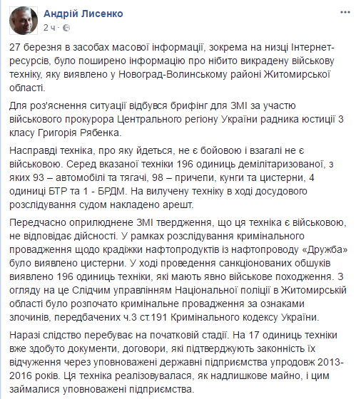 Прокурор напомнил, что техника была обнаружена в Новоград-Волынском в ходе расследования уголовного производства в отношении кражи нефтепродуктов из нефтепровода "Дружба".