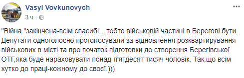 "Война" закончена - всем спасибо ... то есть военной части в Берегово быть", - сообщил на своей странице в Facebook ветеран российско-украинской войны в Донбассе, председатель городской организации ВО "Свобода" Василий Вовкунович.