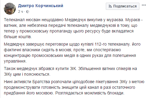 "Мы наблюдаем концентрацию промосковских медиа в одних руках для облегчения управления... Медведчук собрался купить ЗИК. Увеличение ватных спикеров этим и объясняется. Сейчас активисты Братства начали круглосуточное пикетирование с целью продемонстрировать готовность уничтожить этот канал в случае окончательного приобретения его Москвой. Рассматривается возможность блокады", - написал Корчинский.